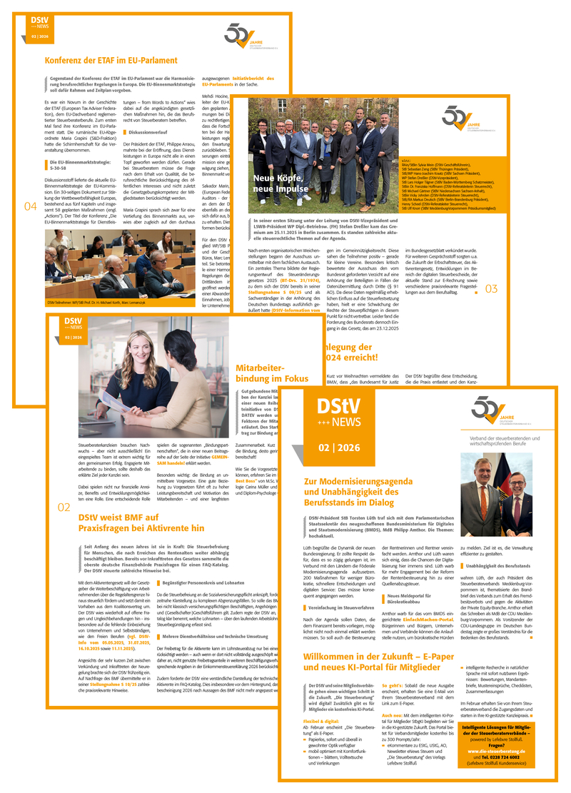 DStV-Präsident mit MdB PStS Amthor im Dialog – DStV-Organ „Die Steuerberatung“ ab sofort nur noch digital – Fachkräfteinitiative: Mitarbeiterbindung im Fokus - DStV-Praxisfragen zur Aktivrente – Neuer DStV-Steuerrechtsausschuss - Schonfrist für Offenlegung der Jahresabschlüsse 2024 – ETAF-Konferenz im EU-Parlament: Erfahren Sie dazu jetzt mehr in der neuen Ausgabe!