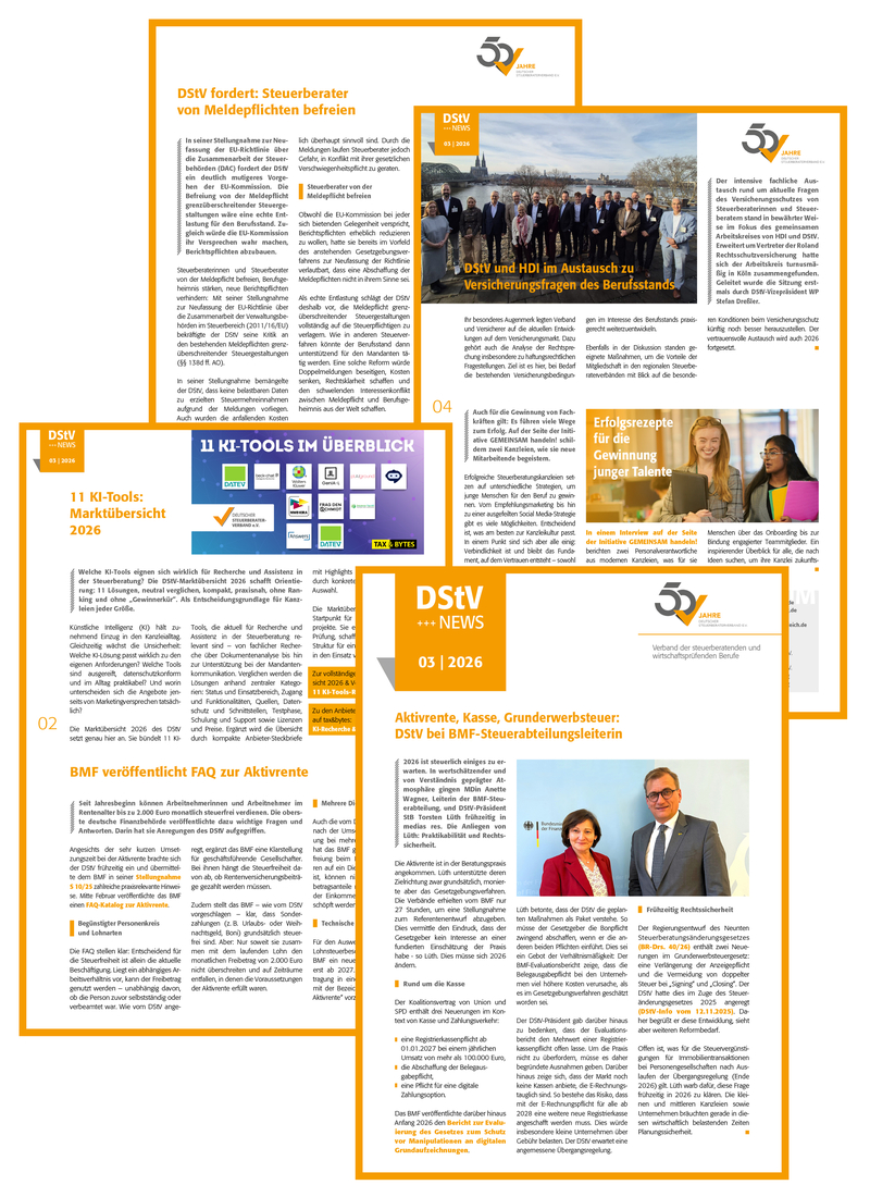 Aktivrente, Kasse, Grunderwerbsteuer: DStV bei BMF-Steuerabteilungsleiterin - 11 KI-Tools: DStV-Marktübersicht 2026 – BMF-FAQ zur Aktivrente - DStV in Brüssel: Steuerberater von Meldepflichten befreien - DStV und HDI im Austausch zu Versicherungsfragen - Erfolgsrezepte für die Gewinnung junger Talente: Erfahren Sie dazu jetzt mehr in der neuen Ausgabe!