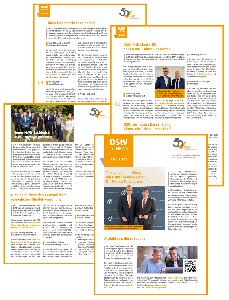 DStV-Präsident im Dialog mit NRW-Finanzminister und neuem BMF-Abteilungsleiter für USt – Steuerfachangestellten-Ausbildung: Spitzenwert im Branchenvergleich – DStV-Positionen zu Entwürfen einer neuen KassenSichV und einer steuerlichen Mantelverordnung – Start des neuen NWB-Fachbeirats mit DStV-Expertise – DStV-Bewertung der EU-Hinweisgeberschutz-Richtlinie: Erfahren Sie dazu jetzt mehr in der neuen Ausgabe!