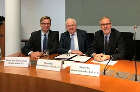 v.l.: Reiner Holznagel M.A. (Präsident Bund der Steuerzahler), WP/StB Harald Elster (DStV-Präsident), Thomas Eigenthaler (Präsident Deutsche Steuer-Gewerkschaft) // Bildnachweis: DStV